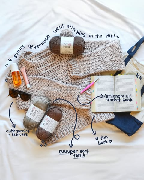3. Smart product integration - Essential tools, yarn, hook, skincare, and sunglasses are all visible and labeled without looking like a hard sell. It subtly showcases everything needed for a perfect crochet outing while keeping the focus on the relaxing scene. Weave products organically into aspirational setups so they feel like part of a lifestyle, not an isolated purchase.