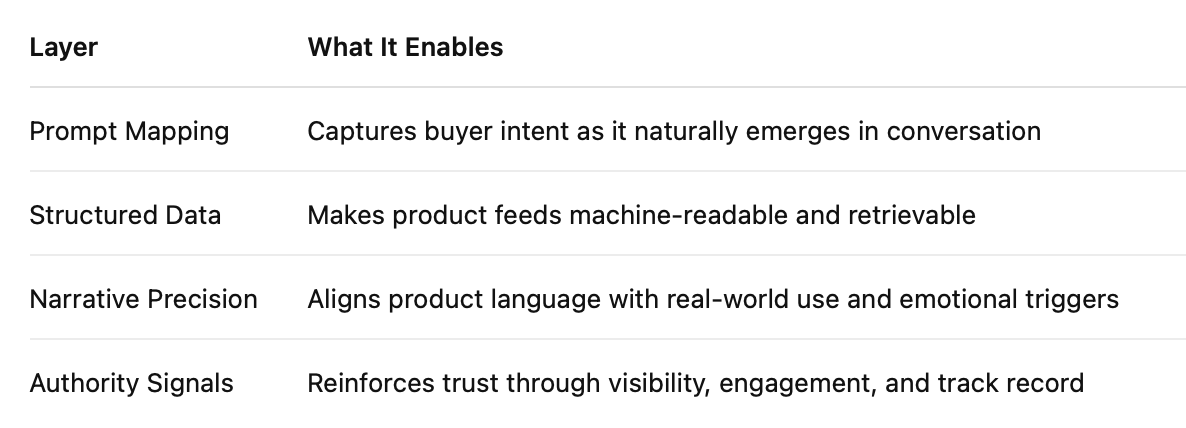 Most brands are failing on layers 1 and 3, prompt mapping, and narrative clarity.
