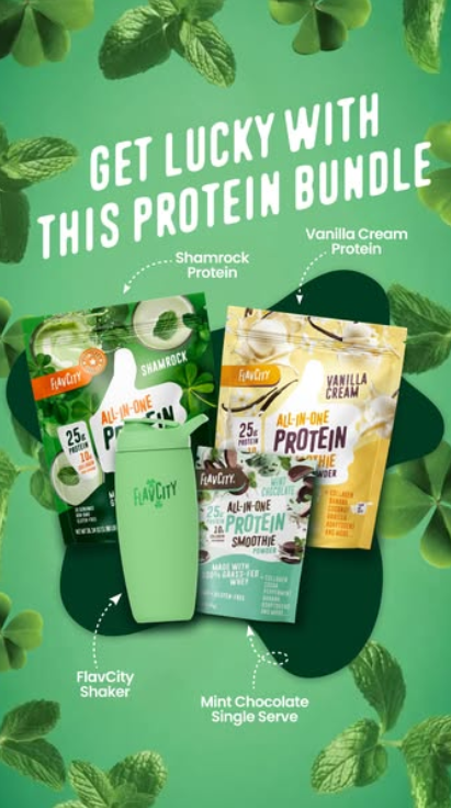 This Is Seasonal FOMO in a Blender: “Get lucky” ties the bundle to a moment. It’s not just protein, it’s a limited-time St. Patrick’s vibe you either grab now or miss.