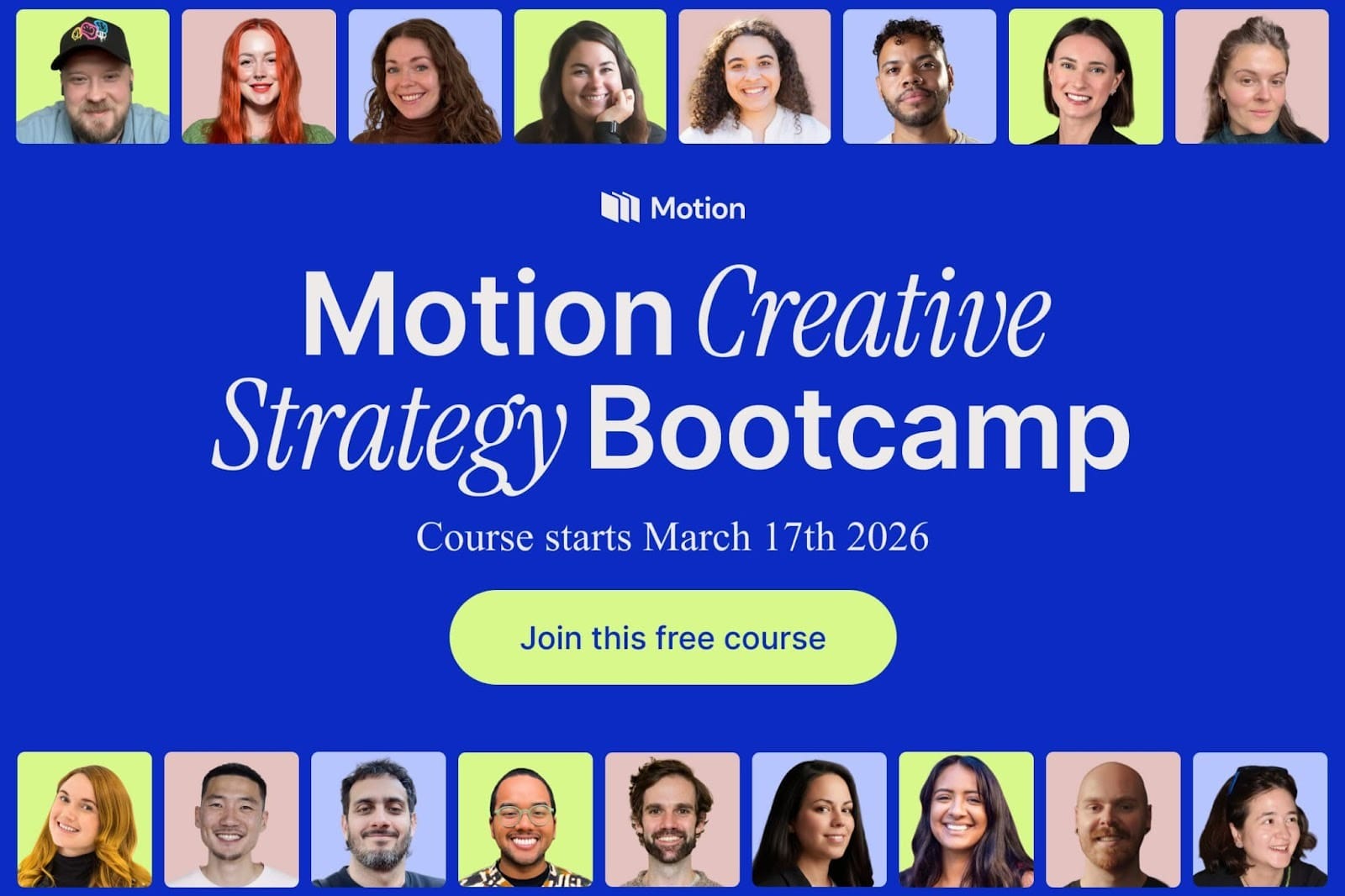 The gap between brands that scale creative and those that don't is a system. Motion's Creative Strategy Bootcamp gives you that system: hooks, AI workflows, testing frameworks, and ads built under live coaching. Oren John directed creative for Red Bull and Grey Goose. Cate Wright runs creative strategy at Monks, Adweek's AI Agency of the Year.
