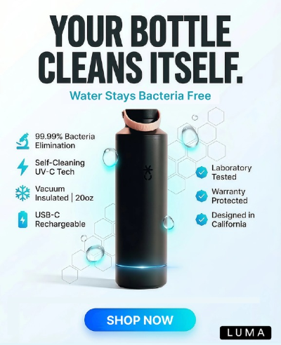 The Headline Is a Sci-Fi Promise Stated as a Boring Fact - "Your Bottle Cleans Itself." No exclamation mark. No "introducing." Just a flat declarative that sounds so matter-of-fact it almost feels like you should've known already.