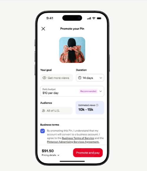 Promote a Pin gives creators and small businesses a simple way to amplify top-performing organic Pins. A few taps, set a budget, and Pinterest's Taste Graph handles targeting across its 619 million high-intent users.
