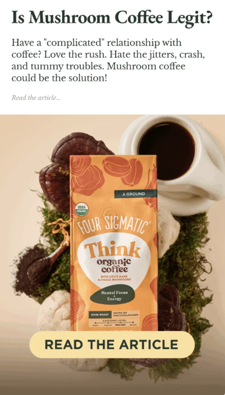 2. Hook / Headline: âIs Mushroom Coffee Legit?â invites skepticism instead of fighting it. It disarms doubt, sparks curiosity, and feels editorial, not salesy.