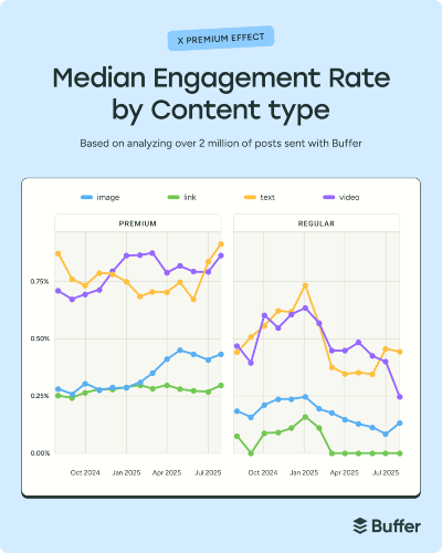 1ď¸âŁ Link Posts Collapse on X - Engagement for link posts on regular X accounts has fallen to 0%, making them virtually invisible. Premium users still see some traction (~0.28%), but even then, text and video posts outperform links by 2â3Ă.
