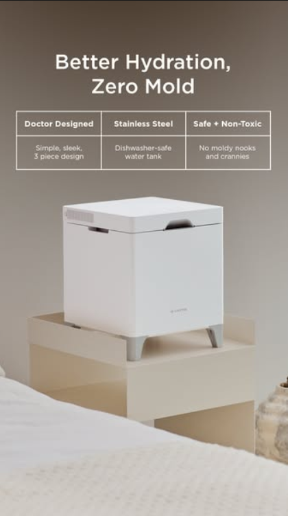 1. Clinical calm as persuasion strategy - The minimalist, beige-toned background creates a sense of sterile serenity, an aesthetic borrowed from medical-grade environments. It frames the humidifier not as a gadget but a wellness instrument, shifting the buying trigger from “want” to “need,” rooted in health authority.