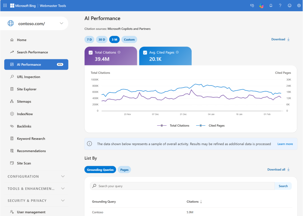 Meanwhile, Bing introduced an AI Performance dashboard inside Webmaster Tools showing total citations, average cited pages, page-level references, grounding queries, and trend timelines across Copilot and AI summaries. Bing now lets publishers see exactly how often and why their content is cited, turning AI visibility into measurable data.