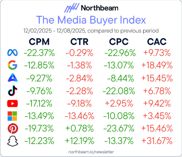 This week’s Northbeam data tells a clear story for DTC operators: traffic is getting cheaper, but customers are getting harder to win. Falling CPCs paired with rising CAC and shrinking ROAS show that the real battle is shifting from acquisition volume to conversion quality.