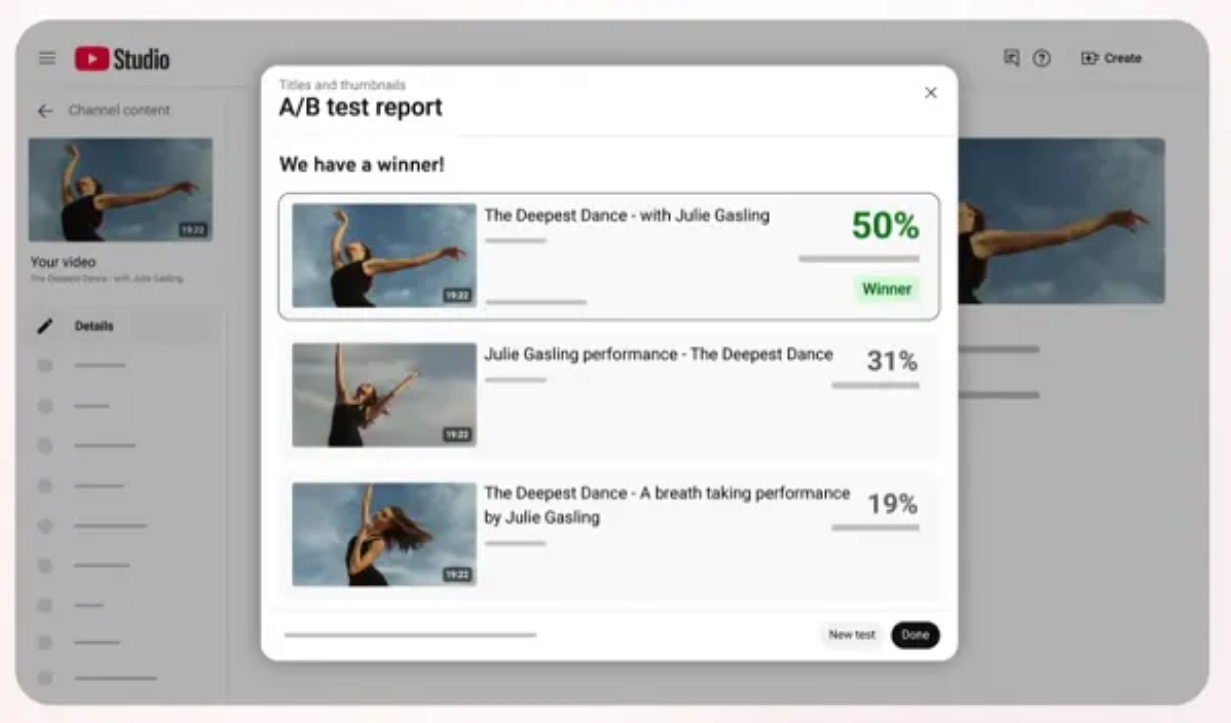 1. YouTube Testing - YouTube now gives all Advanced-Feature creators access to title and thumbnail A/B tests, letting them try three variations and select winners based on watch time, helping creators validate messaging and visuals while tapping into AI-assisted thumbnail creation.